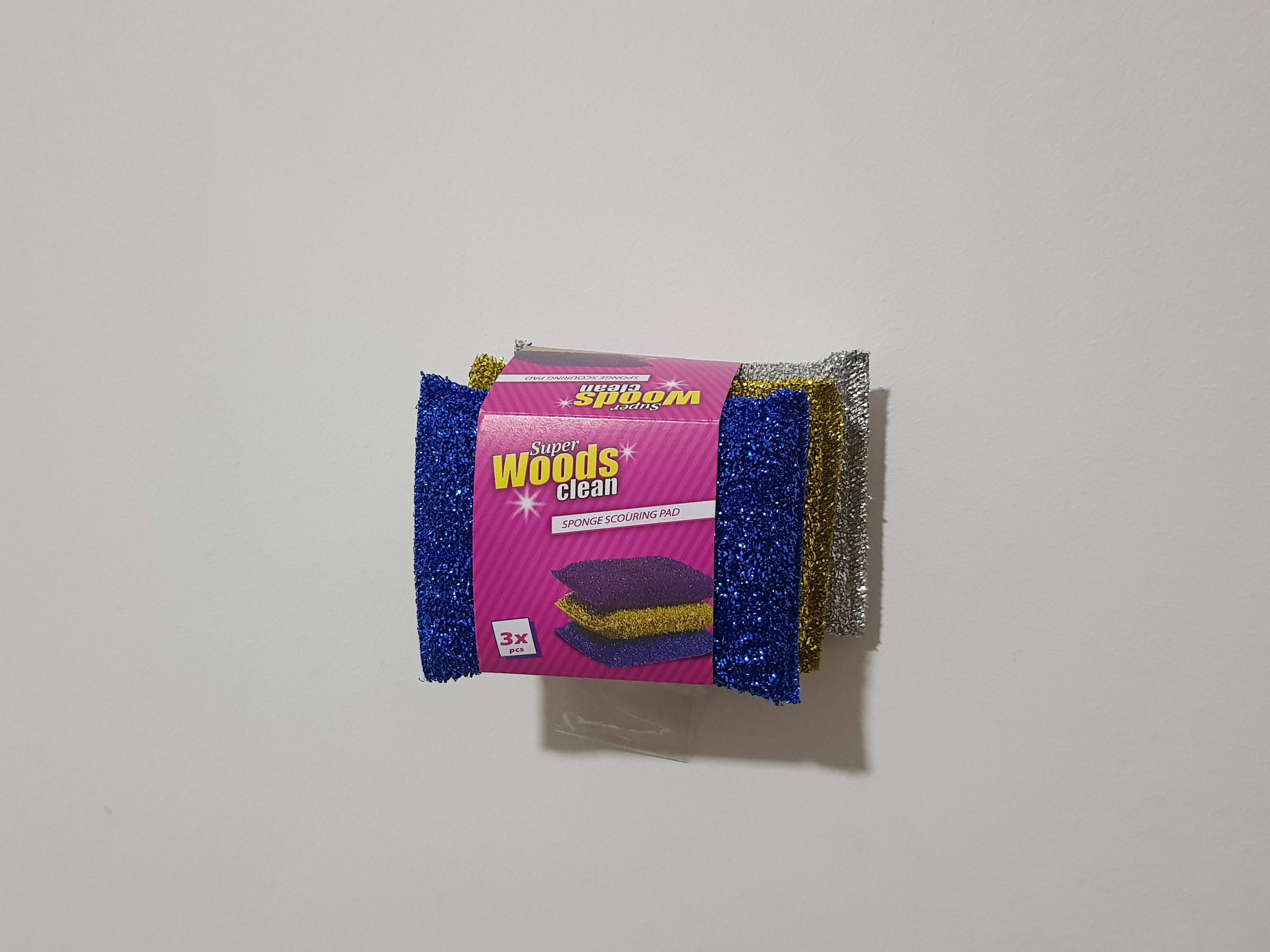 Woods scouring sponge 3/1 Colour:red,blue,yellow,orange,black,white,green,pink Width:9cm Height:3cm Length:11.5cm Volume (L):S18 Material:sponge, Packing: Iner:3 Master:72